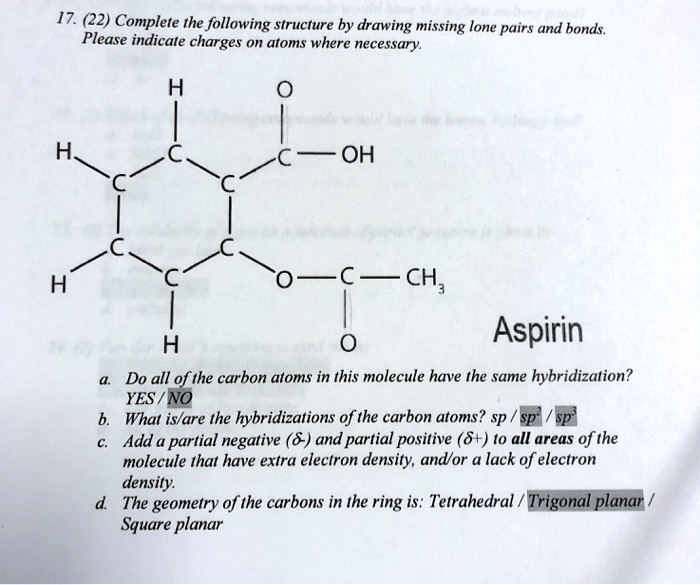 Solved 17 22 Complete The Following Structure By Drawing Missing Lone Pairs And Bonds Please Indicate Charges On Atoms Where Necessary Oh H Ch Aspirin Do All Of The Carbon Atoms This